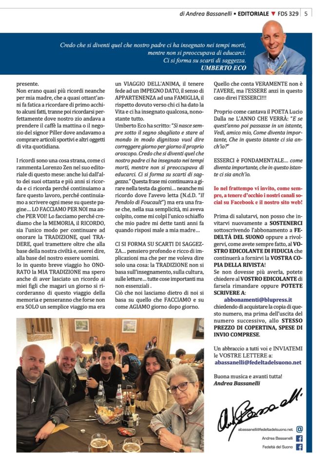 Prima di salutarvi, non posso che invitarvi nuovamente a SOSTENERCI sottoscrivendo l’abbonamento a FEDELTÀ DEL SUONO oppure a rivolgervi, come avete sempre fatto, al VOSTRO EDICOLANTE DI FIDUCIA che continuerà a fornirvi la VOSTRA COPIA DELLA RIVISTA! Se non dovesse più averla, potete chiedere al VOSTRO EDICOLANTE di farsela rimandare oppure POTETE SCRIVERE A: