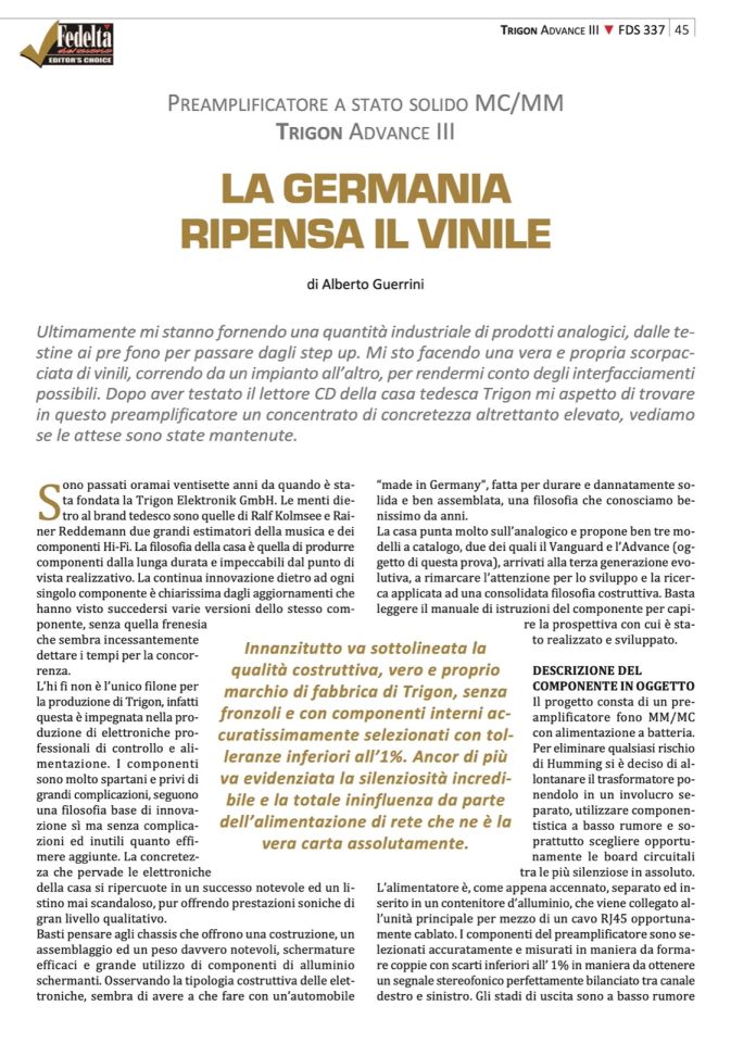FEDELTÀ DEL SUONO #337 – APRILE 2024 – QUANTITÀ O QUALITÀ? – FDS EDITOR’S CHOICE – Preamplificatore a stato solido MC/MM – Trigon Advance III – La Germania ripensa il Vinile