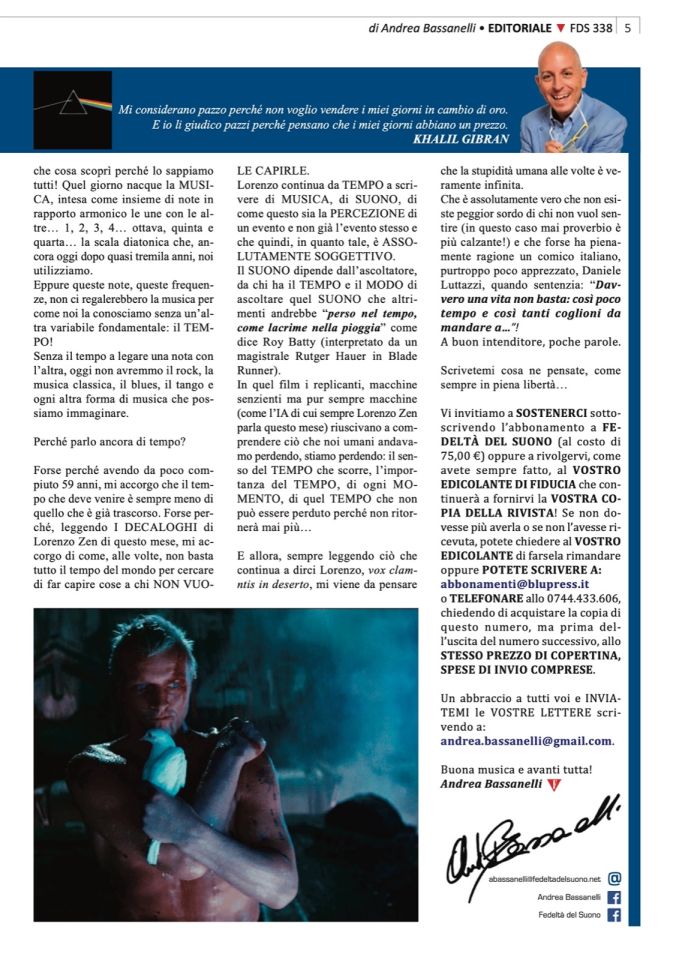 Il SUONO dipende dall’ascoltatore, da chi ha il TEMPO e il MODO di ascoltare quel SUONO che altrimenti andrebbe “perso nel tempo, come lacrime nella pioggia” come dice Roy Batty (interpretato da un magistrale Rutger Hauer in Blade Runner).