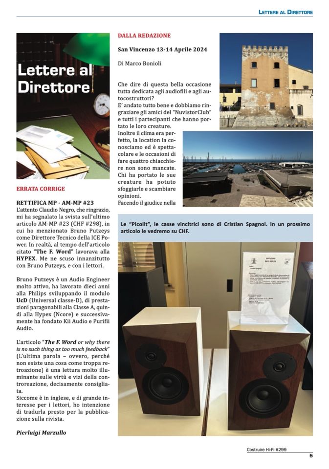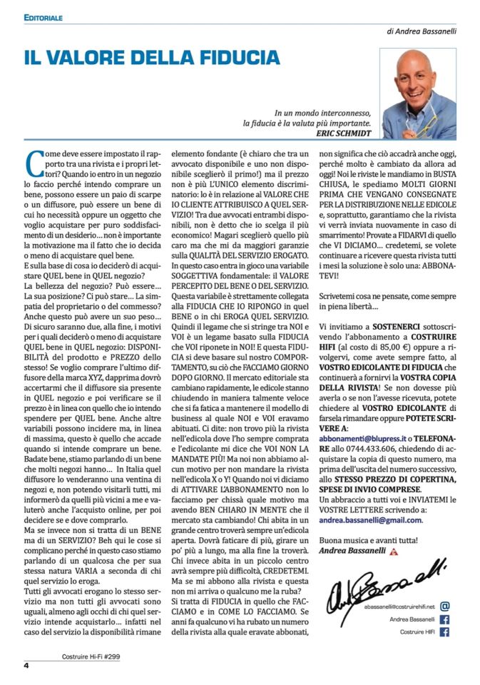 Vi invitiamo a SOSTENERCI sottoscrivendo l’abbonamento a COSTRUIRE HIFI (al costo di 85,00 €) oppure a rivolgervi, come avete sempre fatto, al VOSTRO EDICOLANTE DI FIDUCIA che continuerà a fornirvi la VOSTRA COPIA DELLA RIVISTA! Se non dovesse più averla o se non l’avesse ricevuta, potete chiedere al VOSTRO EDICOLANTE di farsela rimandare oppure POTETE SCRIVERE A: